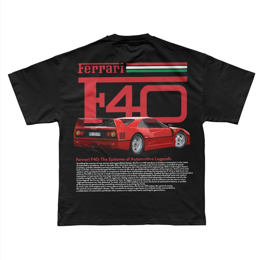 Otomotiv dünyasının efsanesi Ferrari F40’ı sırtınızda taşımaya ne dersiniz? Bu özel tasarım tişört, Ferrari’nin ikonik F40 modelini ve onun efsanevi ruhunu yansıtan çarpıcı bir baskıya sahip. Arka kısmında Ferrari’nin imzası olan kırmızı F40 görseli, İtalyan bayrağı renkleri ve otomobilin hikayesini anlatan metin bulunuyor. Hem konforlu hem de koleksiyonluk bir parça.