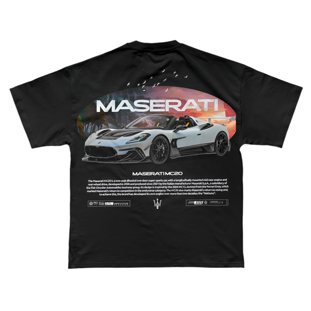 Maserati'nin ikonik MC20 modelinden esinlenerek tasarlanan bu oversize tişört, hem pist tutkusunu hem de şıklığı üzerinde taşımak isteyenler için ideal. Kaliteli kumaş yapısı ve özel baskısıyla fark yaratır.