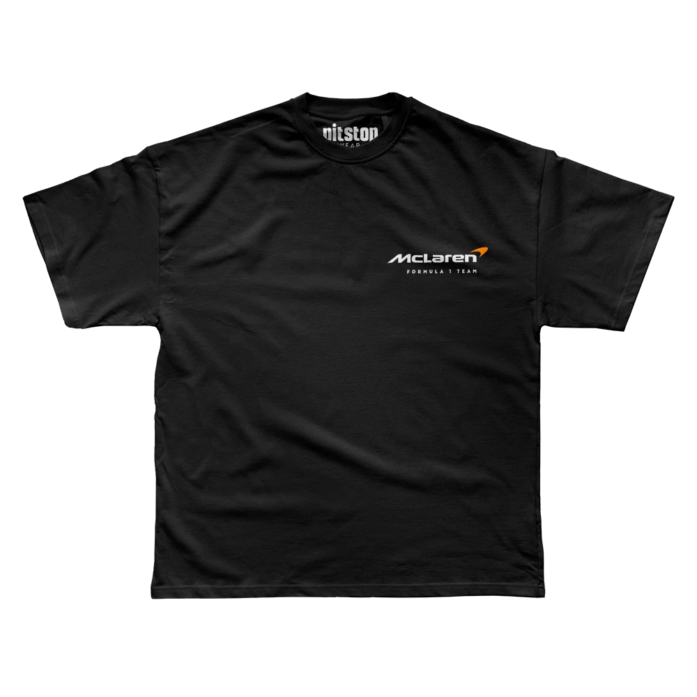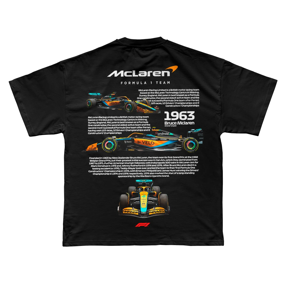 Formula 1 dünyasının köklü takımlarından McLaren Racing için özel olarak tasarlanmış bu tişört, hem takım tarihini hem de modern F1 aracının çarpıcı tasarımını bir araya getiriyor. Arka kısmında McLaren’ın 1963’te Bruce McLaren tarafından kurulmasından bugüne uzanan başarı hikayesi, detaylı grafiklerle sunuluyor.