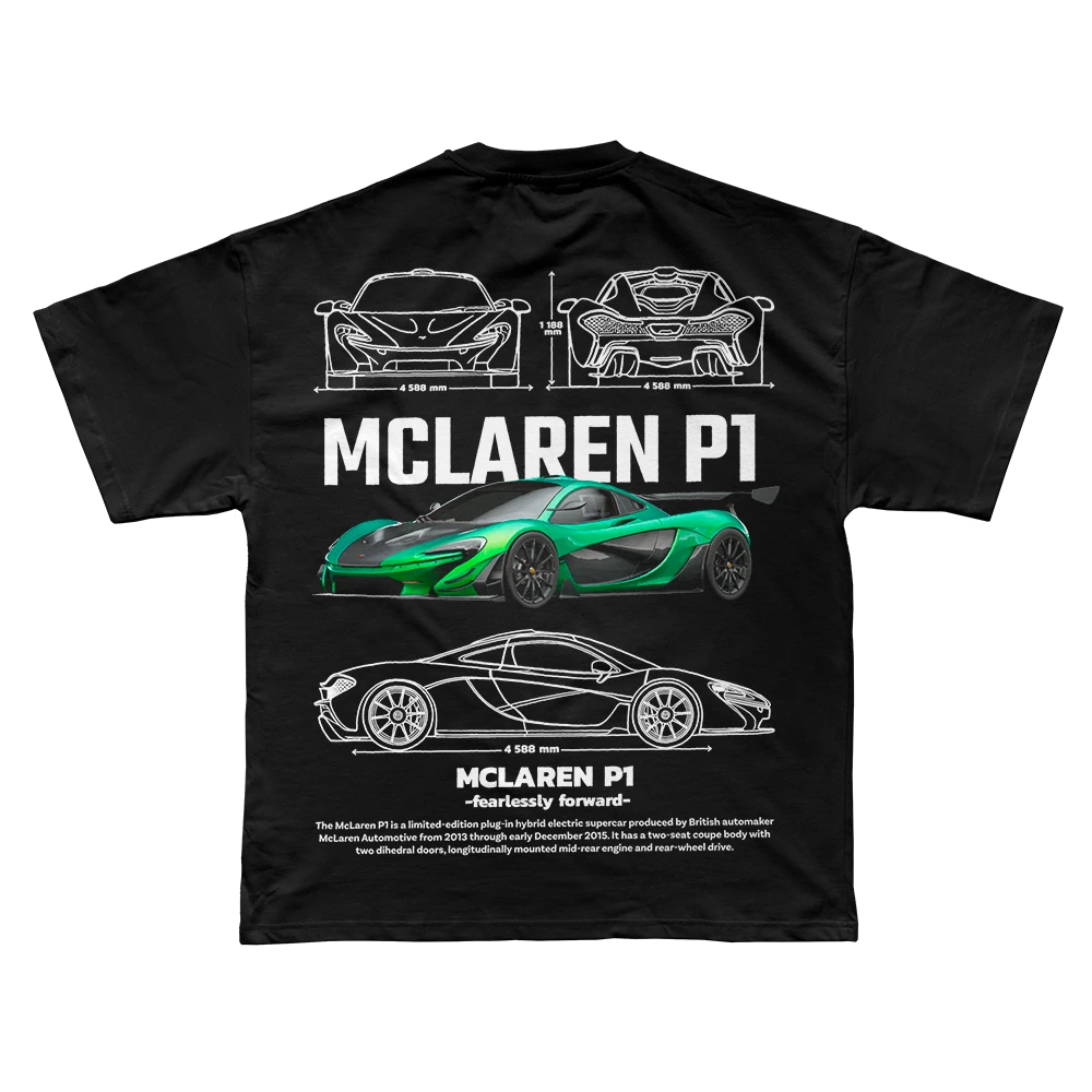 McLaren’in ikonik hibrit süper otomobili P1, şimdi tarzına güç katıyor. Teknik çizim detayları ve canlı renkli baskısıyla bu oversize tişört hem rahat hem dikkat çekici.