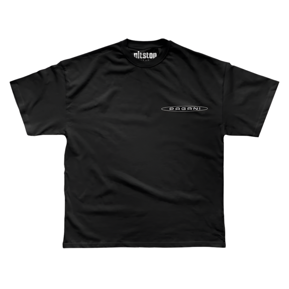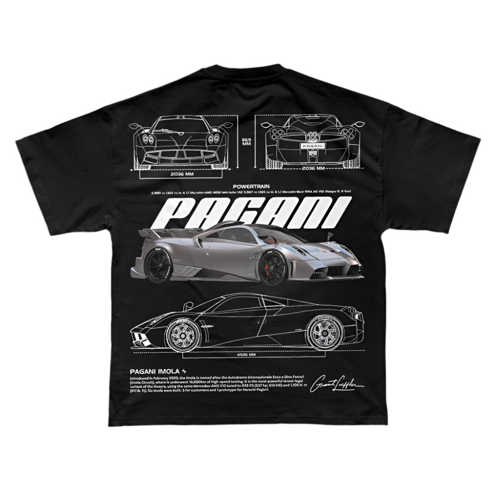 Pagani Imola'nın eşsiz mühendislik ve tasarım ruhunu taşıyan bu oversize tişört, agresif çizgiler ve hiper otomobil detaylarını üzerinde taşımak isteyenler için üretildi. Arka yüzeyde teknik illüstrasyon, ön tarafta minimal Pagani logosu yer alır.