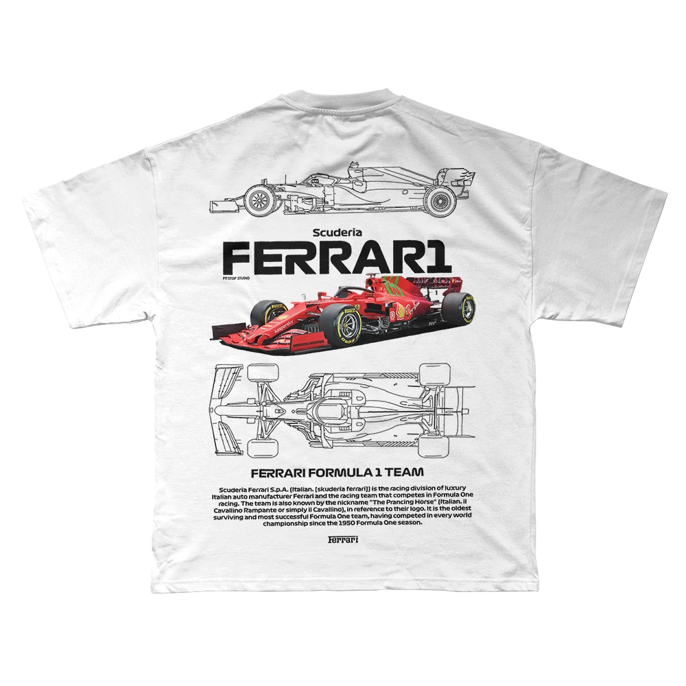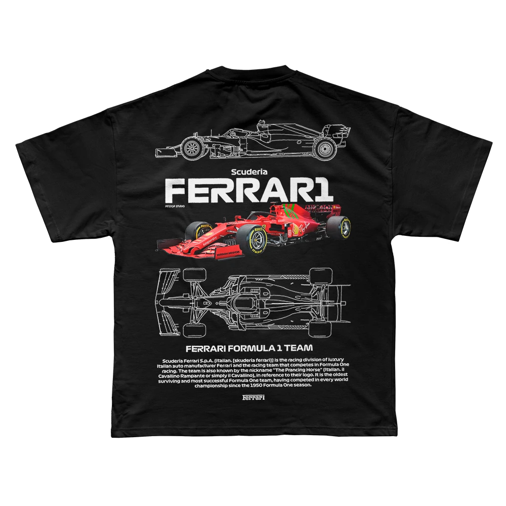 Ferrari’nin Formula 1’deki efsanevi başarısını gururla taşıyan bu tişört, F1 severler için özel olarak tasarlandı. Arka kısmında kırmızı Ferrari F1 aracı ve detaylı teknik çizimler yer alırken, "Scuderia Ferrari" logosu ve bilgilendirici metin tasarımı tamamlıyor. Ferrari Formula 1 takımının yarış ruhunu günlük hayatınıza taşıyın.