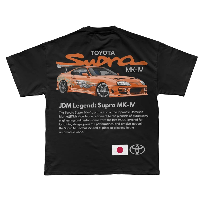 Toyota Supra MK-IV, Japon otomobil kültürünün ikonik sembollerinden biri olarak bu özel tasarım tişörtte hayat buluyor. Arka yüzeyde yer alan 90’ların son dönemine ait JDM (Japanese Domestic Market) efsanesi Supra MK-IV, canlı turuncu renkte detaylı çizimiyle öne çıkıyor.